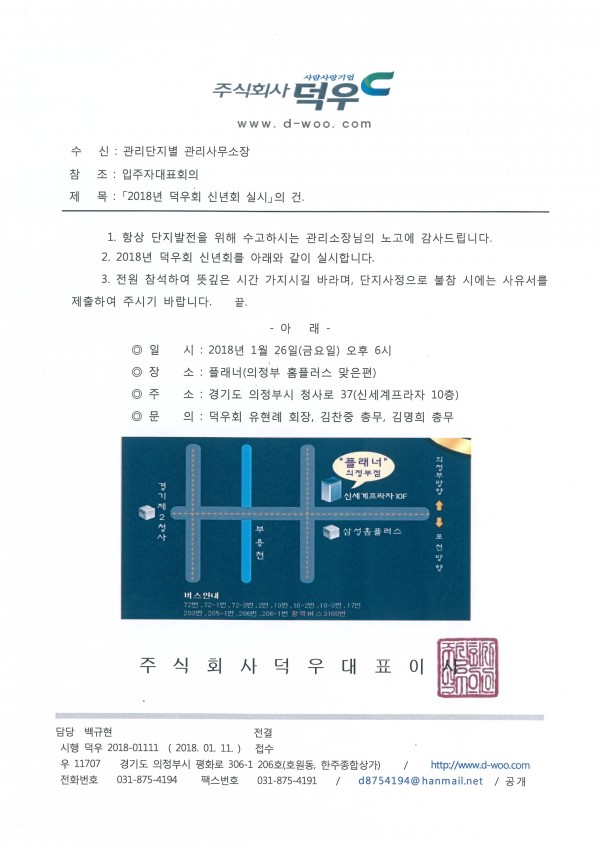 ■ 2018년 덕우회 신년회를 개최합니다. 페이지 정보 작성자 최고관리자 (115.♡.139.242) 작성일18-01-11 13:06 조회8,245회 댓글0건 관련링크 이전글 다음글 목록 본문 전원 참석하시어 뜻깊은 시간을 가졌으면 좋겠습니다.단지사정으로 불참시에는 사유서를 제출하여 주시기 바랍니다. 댓글목록 등록된 댓글이 없습니다. 이전글 다음글 목록